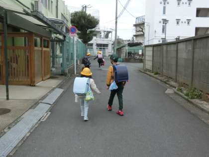 子どもたちの登校する時間です。お日さまが雲に隠れ、寒い朝です。