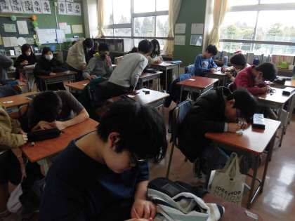 小さい紙の中に自分の似顔絵を書いています。卒業に向けた取り組みの中の一つです。さて、どのように描けたのでしょうか。完成が楽しみです、
