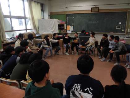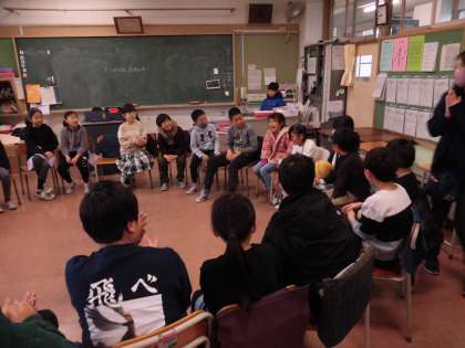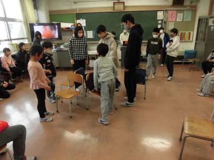 いすとりゲームをしていた班では、後半まで残っていた6年生がいすが取れずにいると、中学年の子たちは「6年生に、いすをまわしてあげた方がいいんじゃないかなあ」とつぶやいていました。6年生は、低学年の子に気を配って譲ってあげたふしもありますが、それを見て、中学年の子は6年生を気遣うという、とても温かい気配りです。