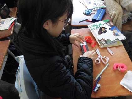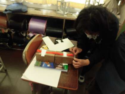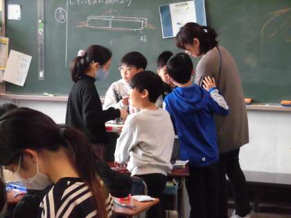 理科では、道具を使って腕の筋肉がどのような動きをするか確かめています。筋肉と骨の関係や筋肉が引っ張られるとどのように腕が曲がるかななど、友達と確認し合っていました。