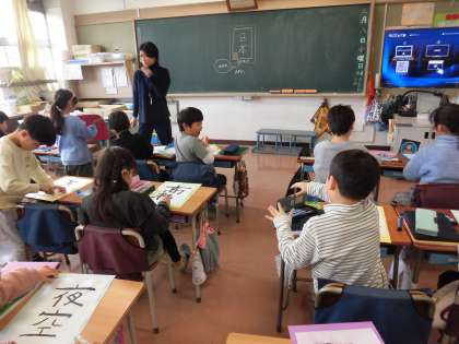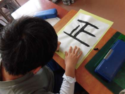 2年生は、お気に入りの言葉を筆で書きました。来年からは、毛筆の授業も始まります。「正」や「日本一」、「前」など素敵な言葉が並びます。2年生に「どうして、その文字にしたの?」と質問すると、「だって、・・・だから」としっかり理由を説明することができる点がとても素晴らしいと感じます。