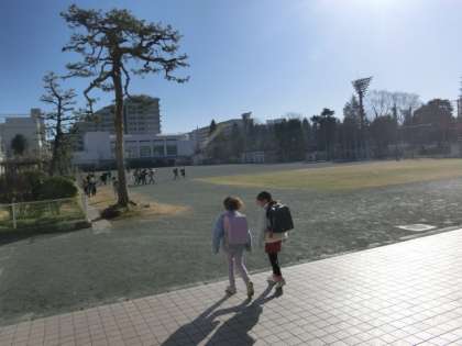 子どもたちが登校してきました。校庭をお日様が照り付けています。まぶしく感じます。