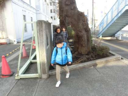 正門のわきの木の陰の小道を通る人がいます。「ここは近道だよ。」と、教えてくれました。