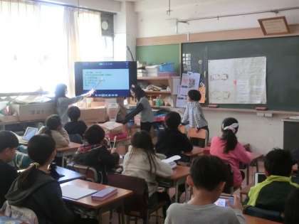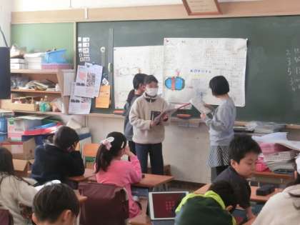 3年生の教室では、ビオトープについての各班の発表をしていました。