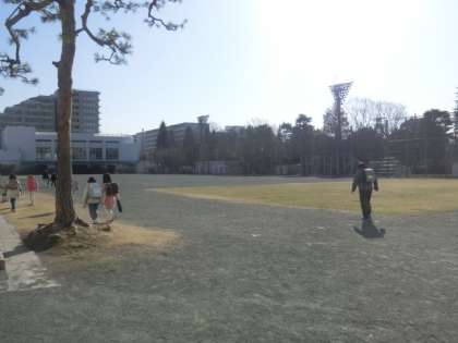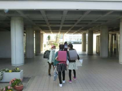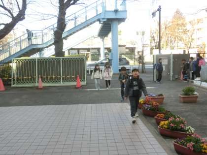 子どもたちが登校してきました。お日さまが顔を出し、気持ちのよい青空です。