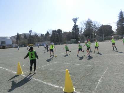 校庭でサッカーをしています。男の子も女の子も一生懸命にボールを追いかけています。得点が入ると、チームみんなで喜んでいます。