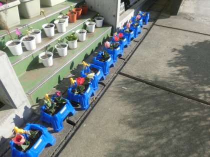 2年生が育てているパンジー、1年生が育てているチューリップ、ともにきれいに花を咲かせています。