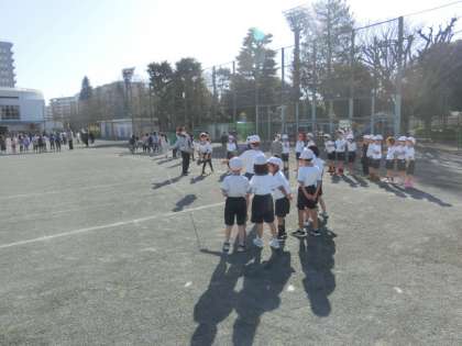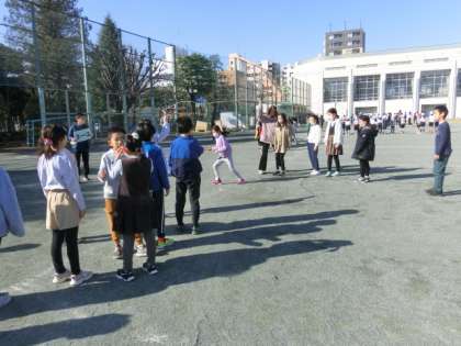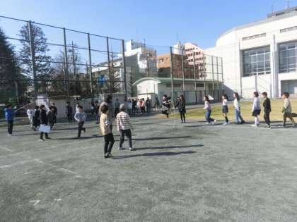 クラスごとに長縄をしています。得意な人もいれば不得意な人もいます。得意な人が、跳び方のアドバイスをしていました。友達にコツを伝えること、それを聞くこと、とても大切なことですね。