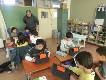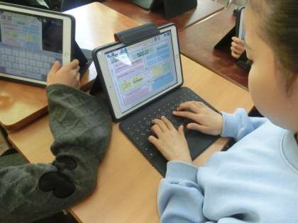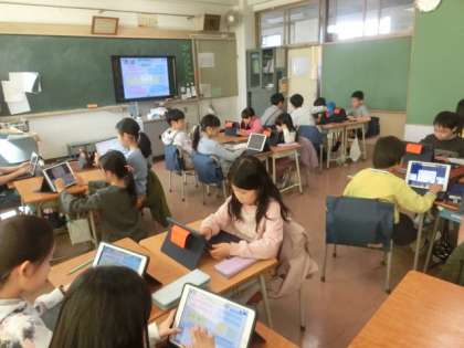 道徳の授業です。教材文から感じたことなどをタブレットに書き込み、班の友達と意見の交流をしています。友達から聞いてことなどもタブレットに書き込んでいます。