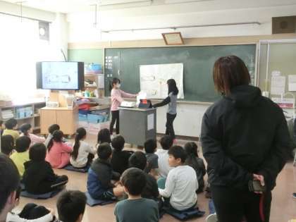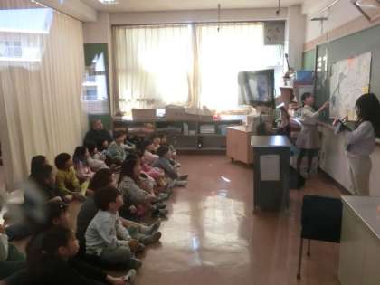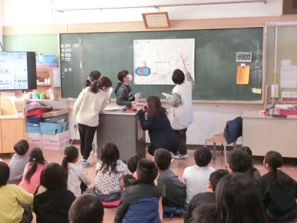 3年生の教室に2年生がやってきました。前の方に2年生が座り、発表を聞いています。テレビや模造紙などいろいろな発表方法があります。2年生も真剣に聞いています。