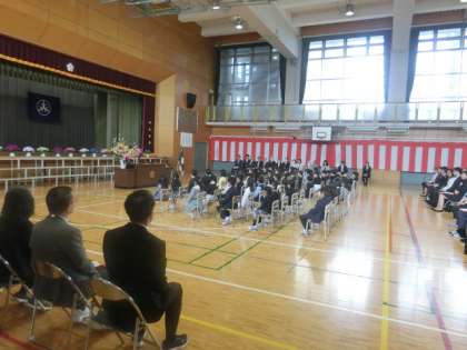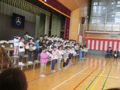 6年生にてをつないでもらい、目を輝かせた1年生が入場してきました。式の中での話などを1年生はしっかりと聞いています。6年生代表からの「歓迎の言葉」、2年生からの「歓迎の催し」がありました。6年生も2年生もとても立派でした。