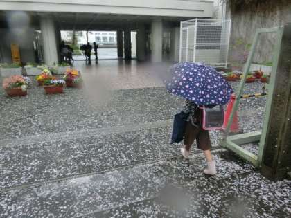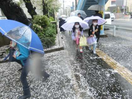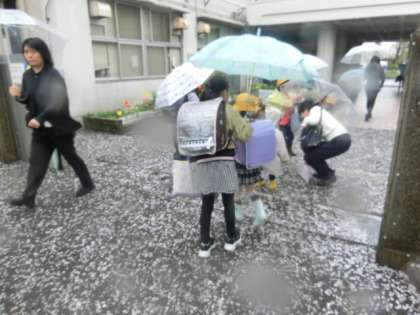 桜の花びらが落ちる道を子どもたちが歩いています。「校長先生、桜散っちゃったね。」そういうことに目を向け、表現することのできるすてきな子どもたちです。