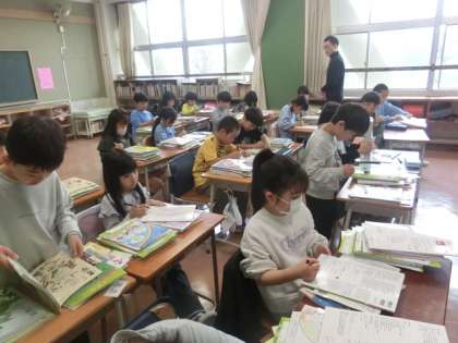 3年生では教科書を子どもたちに配布していました。新しい教科書を手にして、子どもたちは嬉しそうです。地図帳を開いている人がたくさんいました。「ここ行ったことある!」そんなことをつぶやいている人もいました。
