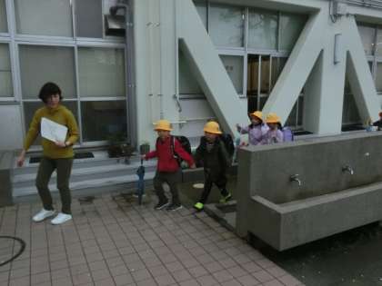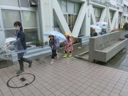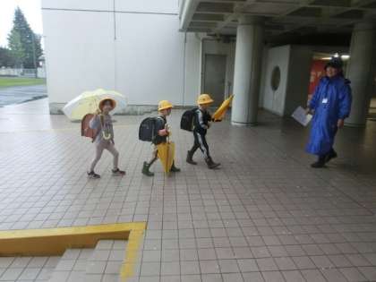 1年生は地域ごとに集まり、教職員が途中まで付き添って下校をします。朝から雨が降っていますが、この時間だけ小雨になりました。風が少し強いので、飛ばされないように歩いてほしいと思います。
