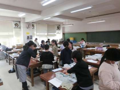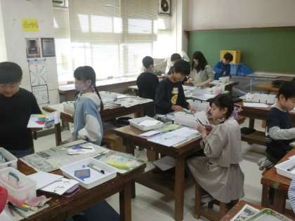 4年生の授業は図工です。絵の具のいろいろな使い方の学習です。