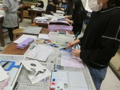 「デカルコマニー」「スパッタリング」「ドリッピング」「ビー玉絵」など、子どもたちはいろいろな技法を試しています。とても楽しそうに活動しています。