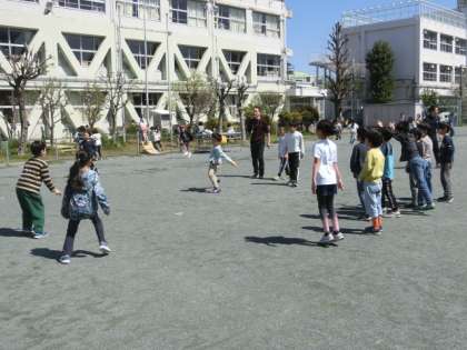子どもたちが校庭を走り回っています。先生も出てきて、子どもたちと一緒に遊んでいます。