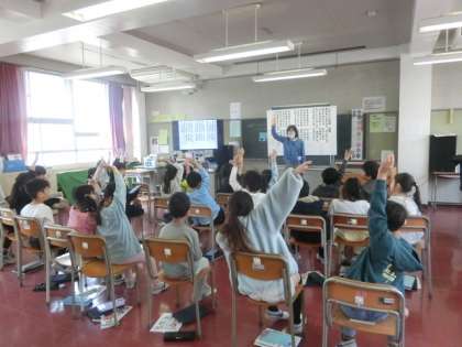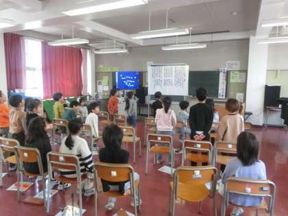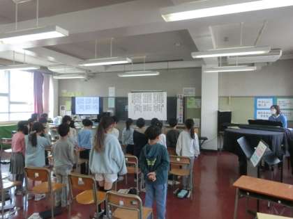 校歌を歌っています。校歌は3番まであります。覚えるのはなかなか大変ですが、2年生の子どもたちはしっかりと覚えているようです。みんなで元気に校歌を歌っていました。
