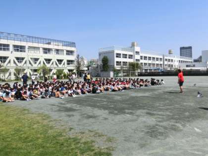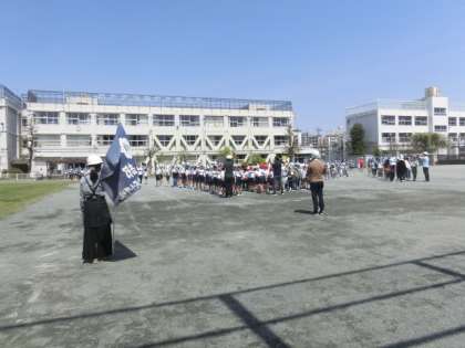 緊急放送の後、子どもたちが真剣な表情で校庭に避難してきました。