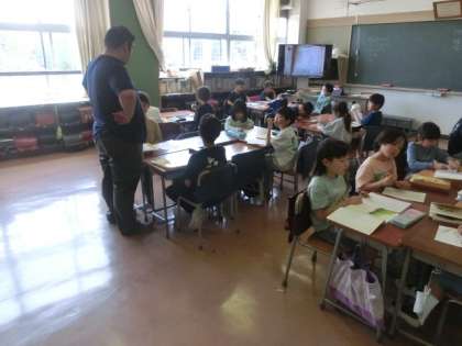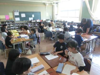 ワークシートに一言日記を書いていました。昨日のことを題材にしていますが、さっと書きはじめる人と、少し考えてしまう人がいました。しかし、少し友達と話をすることで、鉛筆を走らせることができた人がたくさんいました。