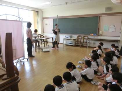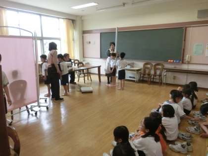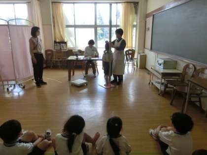 体育着に着替えてランチルームに移動して行いました。身長と体重をはかります。