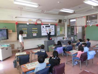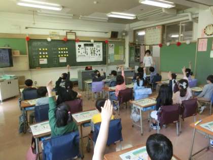 ものの数を数えています。そのものの上にブロックを置き、かずを分かりやすくしています。子どもたちは手をピシッと伸ばして挙手をし、しっかりと発言をしています。