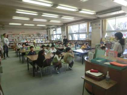 3年生の授業は図書です。図書室に移動し、司書の先生から図書室の使い方や本の扱いについての話をしてもらっていました。