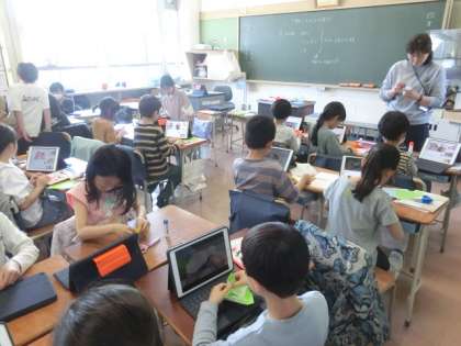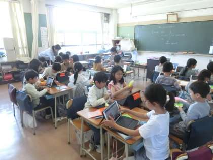 隣のクラスでは、総合の時間に1年生のためのプレゼントづくりをしていました。折り紙でいろいろなものを作っています。作り方が分からない人は、タブレットで作り方の動画を見ながら作っています。1年生に喜んでもらえるように頑張って作っている3年生です。