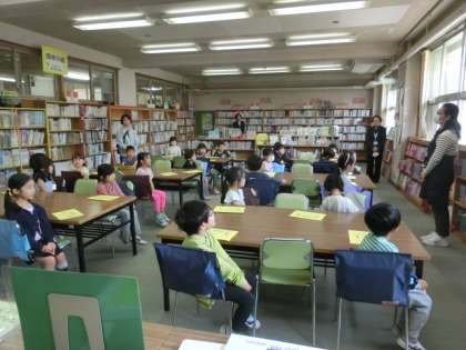 1年生は図書室に移動し、図書の学習をしていました。先生や司書さんから図書室のつか板などの約束を教えてもらっていました。