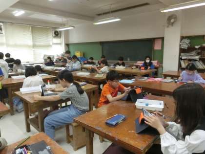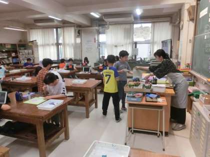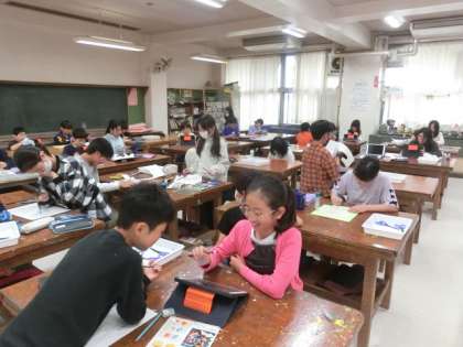 5年生の授業は図工です。「らくがきから形をみつけよう」と題して、自分で描いた曲線からイメージを広げデザインを作っています。