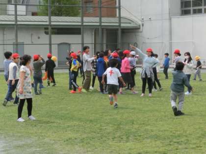 中休みになりました。たくさんの子どもたちが校庭で遊んでいます。