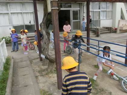 たくさんの1年生が、1輪車の練習をしています。1輪車が大人気です。頑張って練習して乗れるようになるといいですね。