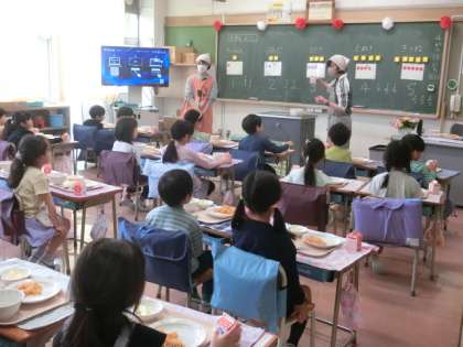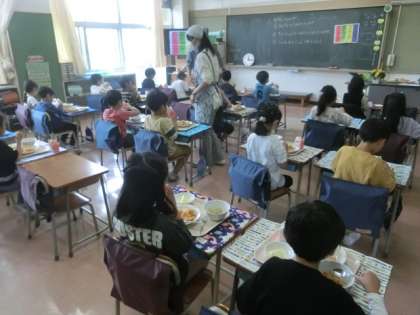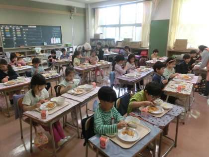 1年生は今日から給食が始まります。1年生の子どもたちは、給食を楽しみにしています。「ケッチャップご飯、大好きだから、楽しみにしてた。」たくさんの1年生が言っていました。準備も上手にできました。「いただきます」をして、食べ始めました。ニコニコ顔の1年生です。