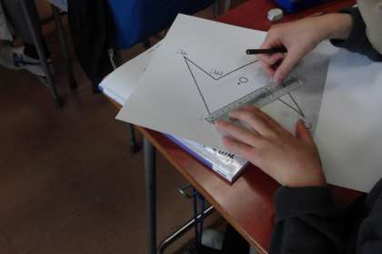 画用紙に描かれている図形について実際に長さを測ったり、角度を調べたりして点対称な図形の特徴を明らかにしてしていきました。