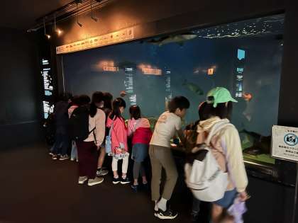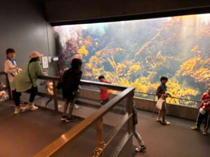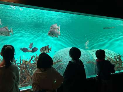 水族館の中です。たくさんの魚たちがいます。