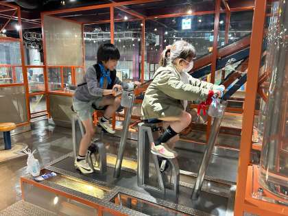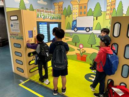 運転を体験するゲームが人気です。たくさんの人たちが並んでいました。