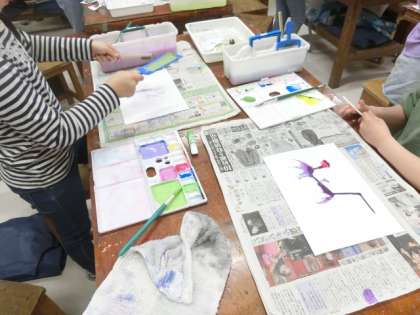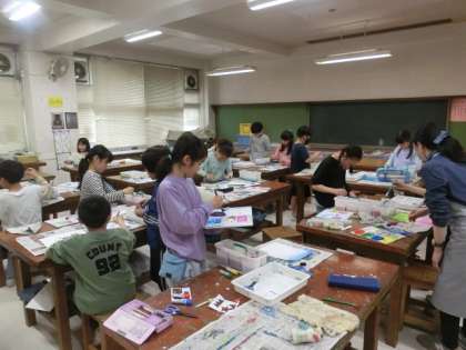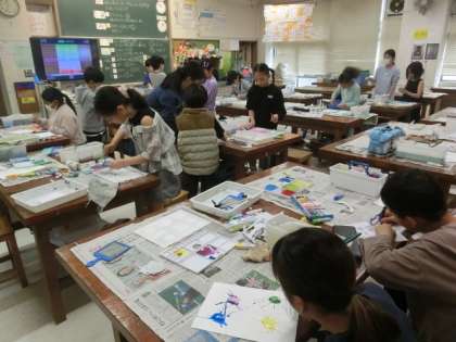 4年生の授業は図工です。「絵の具のぼうけん」と題して絵の具のさまざまな技法の学習です。はけ、ブラシ、網、ストローなどいろいろな道具を使って、子どもたちは模様をつくっています。道具を使うことで、筆では作ることのできない模様が出来上がります。子どもたちは、そのつくる過程を楽しんでいます。