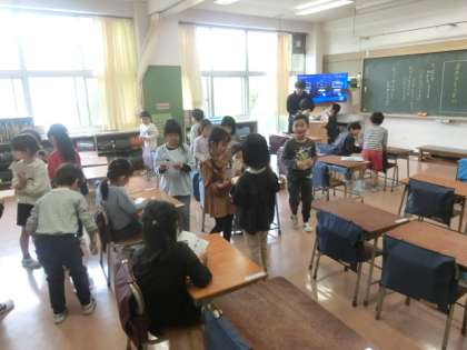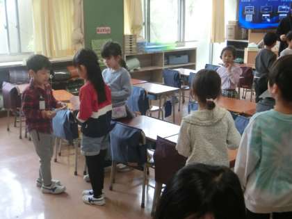 1年生の教室では、自己紹介カードを使っての自己紹介をしあっていました。相手にカードを渡しながら、自己紹介をしています。