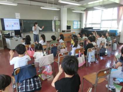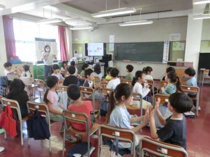 2年生の授業は音楽です。歌に合わせてペアを作り、リズム遊びをしています。とても楽しそうに二人組で動きを合わせています。「やりたい。やりたい。」と、声をあげる子どもたちです。