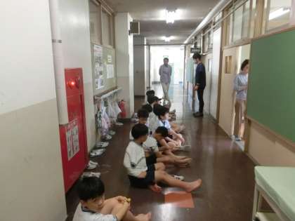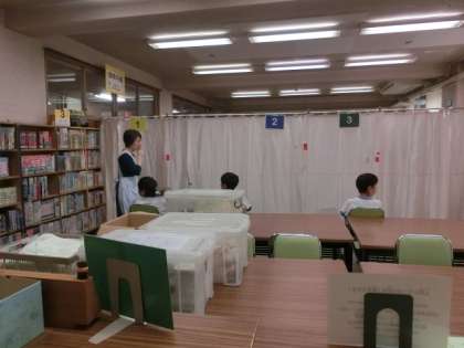 今日は1年生と4年生の心臓検診がありました。会場は図書室です。順番を待つ人は図書室前の廊下で静かにしています。