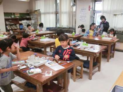 2年生の授業は図工です。「ストローくるくる」と題して、ストローを使った紙工作をとおして、材料の特性を生かす学習をしています。ストローを回すと、ストローに貼ったキャラクターが動きます。
