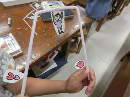 子どもたちは好きなデザインのキャラクターを作り、ストローを回して楽しんでいます。
