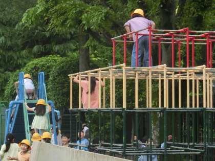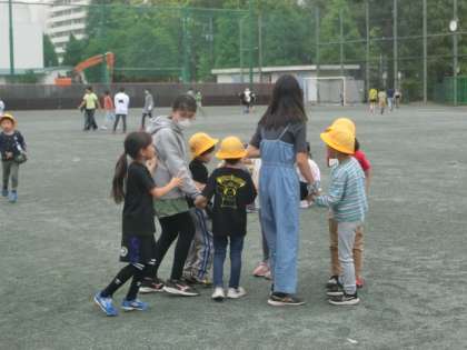 子どもたちが校庭に出てきました。ボール遊びやおにごっこ、ジャングルジムで遊ぶ人もいます。6年生のところに1年生が集まっています。1年生も6年生もとてもうれしそうです。