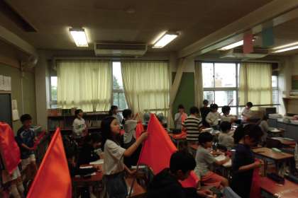 5・6年生は運動会で使う道具の準備を進めていました。それぞれの教室でみんな笑顔で大きな旗を受けとりました。