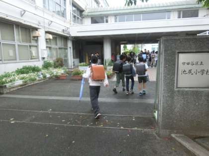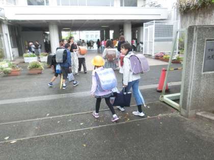 子どもたちが登校する時間は、雨が降っておらず、子どもたちはかさをささずに登校することができました。