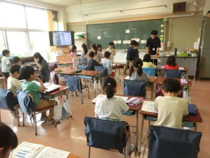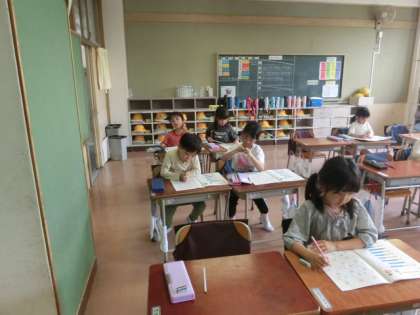 10はいくつといくつに分かれるかを考えています。子どもたちはドリルに記入し、できた人は先生に見せに行っています。できた人は、私にも嬉しそうに見せにきてくれました。