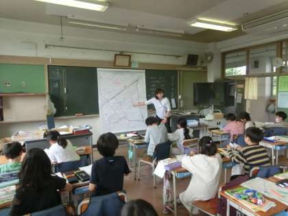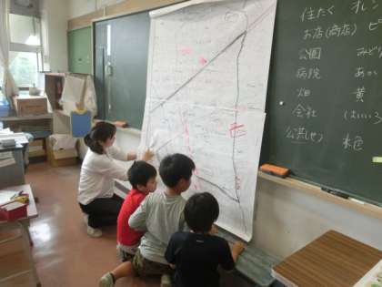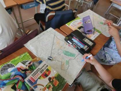 実際に歩いて知っている地理と地図で見たものとを一致させ、子どもたちは喜んでいます。「そこ知ってる!」「行ったことあるよ!」そんな声がたくさんあがっていました。