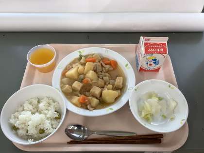 牛乳・グリンピースご飯・肉じゃが・大根とキャベツの甘酢かけ・みかんゼリー