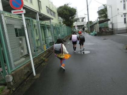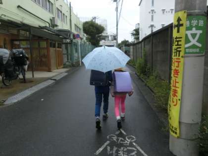 子どもたちが登校してきました。小雨がぱらつく朝です。