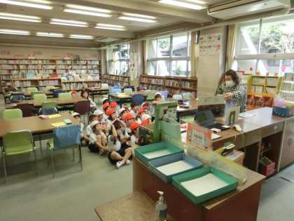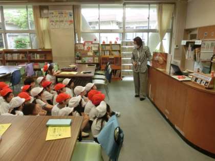 図書室で本の読み聞かせです。子どもたちが前に集まって、大きな絵本を見ています。